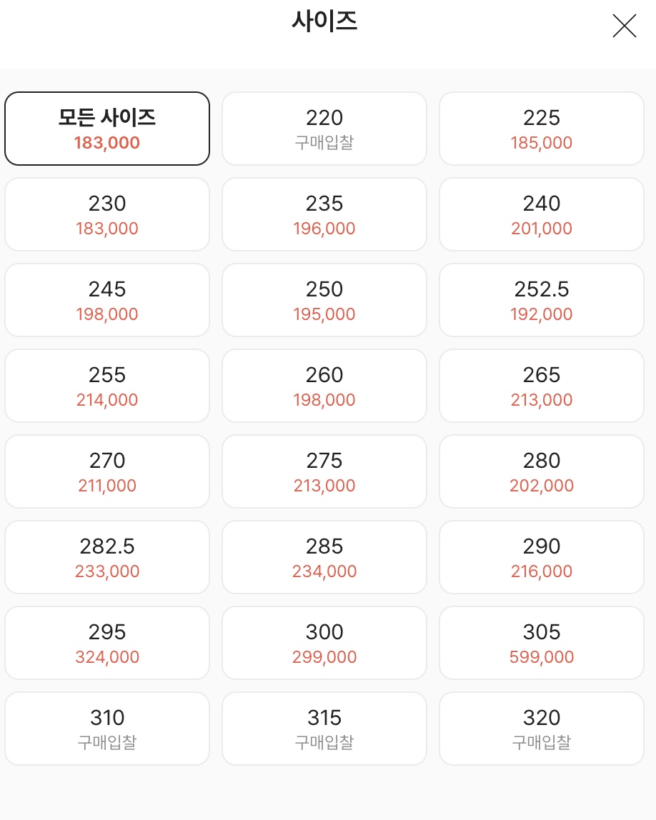 저희 나라에서 제일 큰 리셀 플랫폼인 "크림" 기준으로 보시면 사이즈 별로 가격이 다르지만